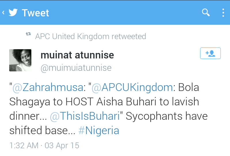 Bola Shagaya, Chairperson: Asociation of Any Government in Power. Where was Bola when Aisha Buhari was campaigning ? Eye sevice. Aisha, kindly press ignore button will all your strength. How can she dump Mama piss so soon.