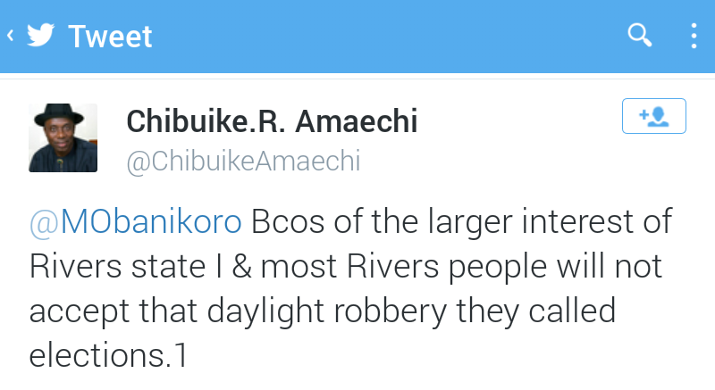 Choi! See fight! Serves obanikoro right! Why is he mentioning Amaechi's name? Can't he tweet wateva he wants to without calling Amaechi's name? Is Amaechi the only one contesting the outcome of the elections? Na so amaechi dey give am sleepless nights? Abeg he shld face his lane joor!