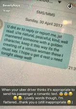 Excuse me Beverly, This is not inappropriate in any way. We don't know the kind of conversation you had with him during the journey which must have prompted him to send you a complimentary text. Please take several sits. Just cause he's a driver doesn't make him less of a man. Who are you by the way? I know some freaking rich guys dt does uber just cause they love driving n decided to make extra cash while doing what they love.