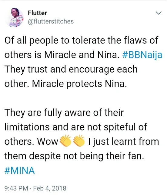 So I saw the kiss between @Nina and @Miracle...okey,we dey here dey wait...I just dey fear this show...