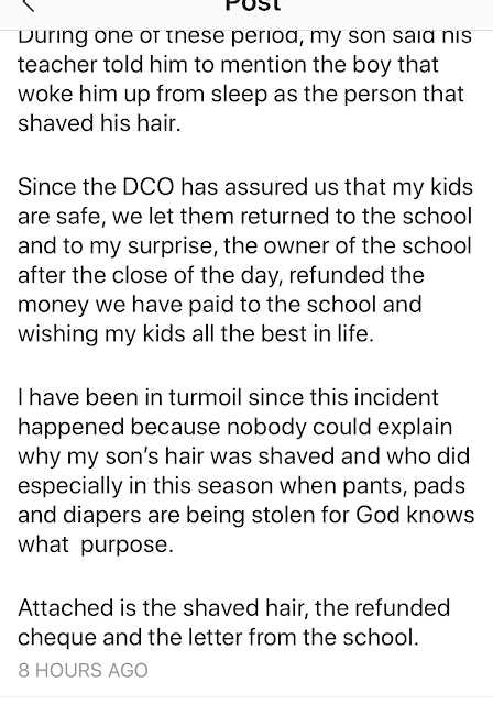 She told her story on Instagram and Details how shocked she was to see that her sons hair had been shaved off......She says in these days of money ritual,she cannot keep quiet....