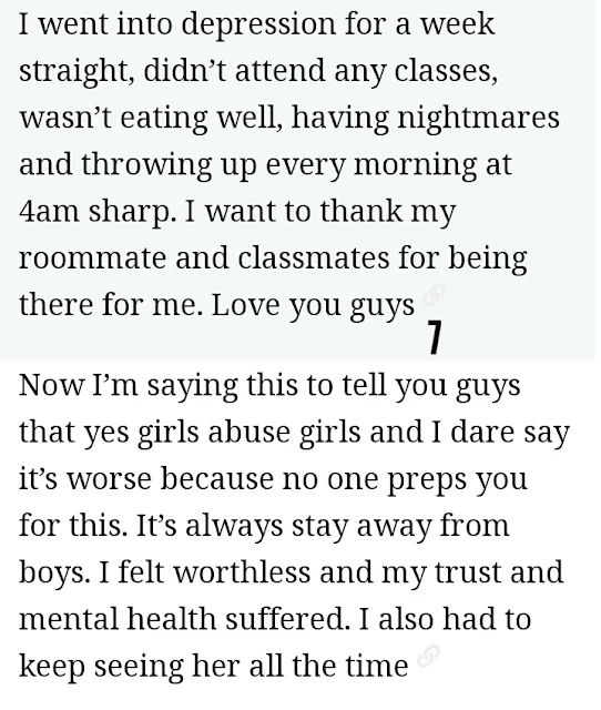 Biko go and relax young lady that was not abuse jor.. The girl is either a lesbian or bisexual.... She nor rape u.. She made advances at u and u refuse simple....which one b d emotional break down and u could not go to school for a week...mtweeeeeee u people should jst leave somebody wit all did pretence