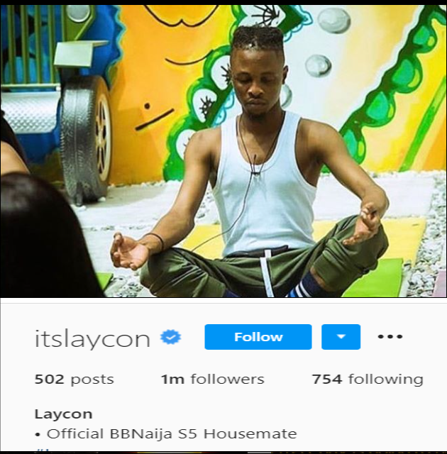 Big brother Naija season 5 housemate Laycon is the first housemate to still be inside the house with the competition ongoing and reach 1 million followers on any social media handle.......