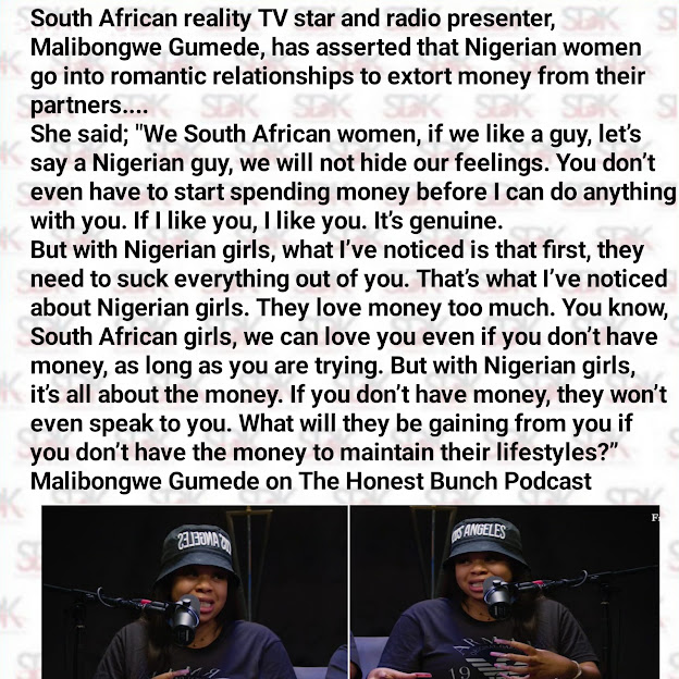South African reality TV star and radio presenter, Malibongwe Gumede, has asserted that Nigerian women go into romantic relationships to extort money from their partners.